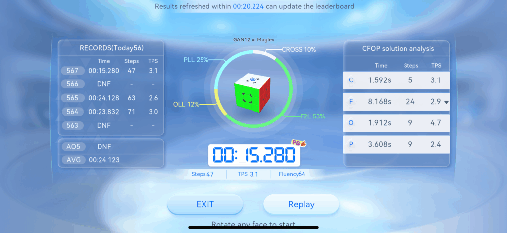 今までのルービックキューブの最高記録が数ヶ月前のものだったので、全体的に速くなってる気もしてたから、そろそろかなと思ってた。0.287秒縮まった。15.280秒。もうちょっといいタイム、運さえ良ければ出そう。